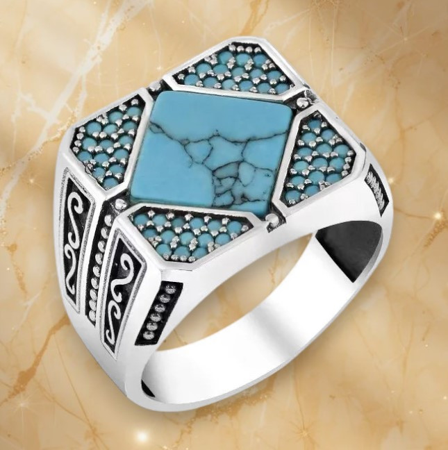 Сріблястий чоловічий перстень-печатка з ромбовидним бірюзовим каменем та бірюзовими бусинами з візерунками з ювелірного сплаву. Розмір 21.5. Підходить для повсякденного носіння або як подарунок. Дизайн з ромбовидним каменем та бусинами з візерунками.